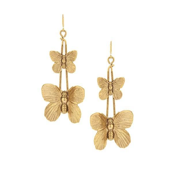 Double drop down butterfly earrings. 22K antique gold plated over brass. Hand crafted in New York.