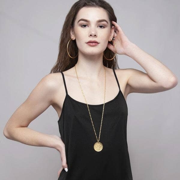Perfect for wearing alone or layering. Vintage-inspired Roman coin necklace. 22K antique gold plated over brass. Handcrafted in New York.